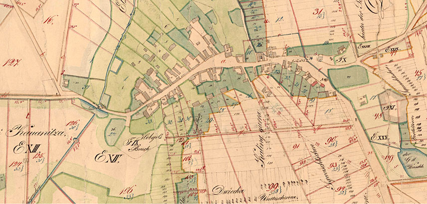 der Brouillonkarte des Dorfes Kuschkow, Ursprung für die heutigen Liegenschaftskarten bzw.