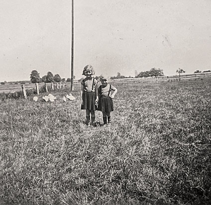 die Schwestern Karin und Edita Rattei beim Gänsehüten auf Ratteis Wiese.