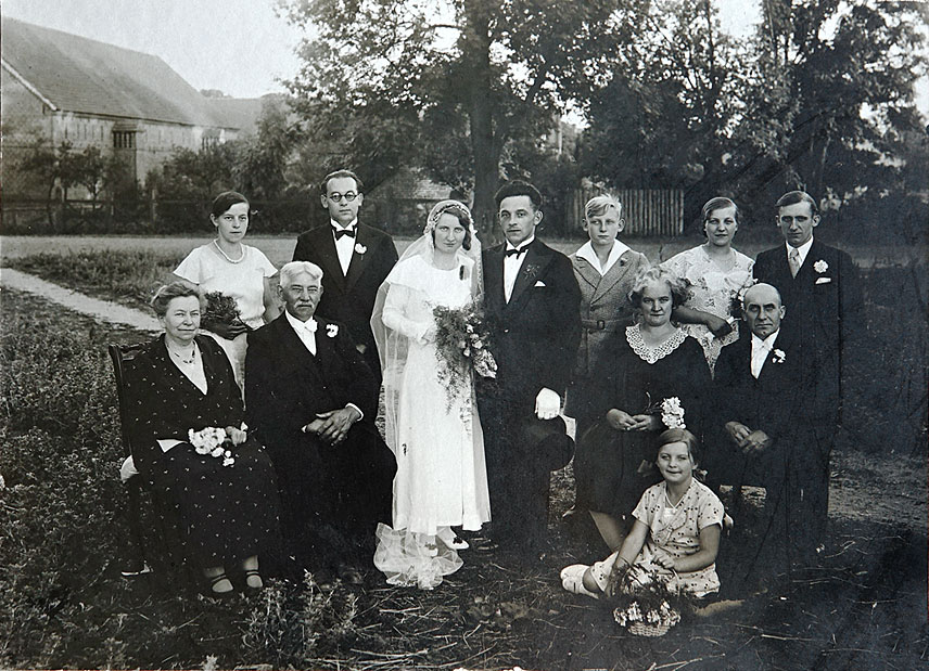 Hochzeit von Otto und Berta Schulze. Auf der Tafel über der Hauseingangstür