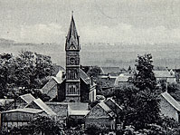 mit Kirche, darunter die Gastwirtschaft von Johanna Schützke und das