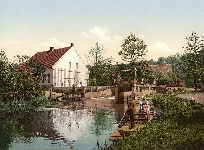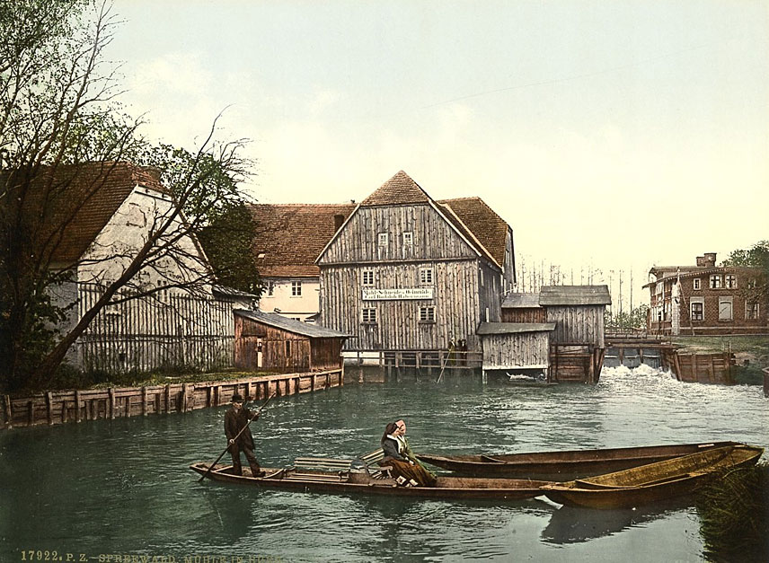 Burg im Spreewald, Mühle, kolorierte Schwarz-Weiß-Fotografie
