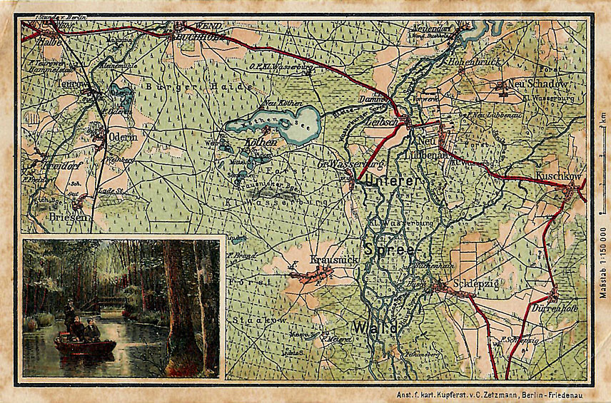 unten ein kleines koloriertes Schwarz-Weiß-Foto mit Spreewaldfließ.